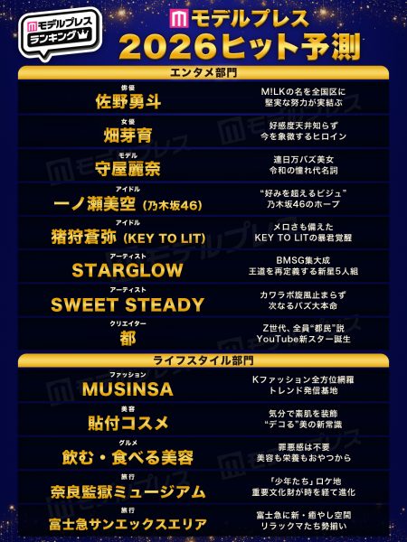 年末恒例、女性向けエンタメ&ライフスタイルニュースサイト『モデルプレス』による「モデルプレスヒット予測」。11年目を迎える今年も、月間12億インプレッションを誇る自社SNSをベースに読者アンケートを実施。読者のリアルな声に、モデルプレス編集部の目利きを加えて完成した2026年完全予測を部門別に発表しました。